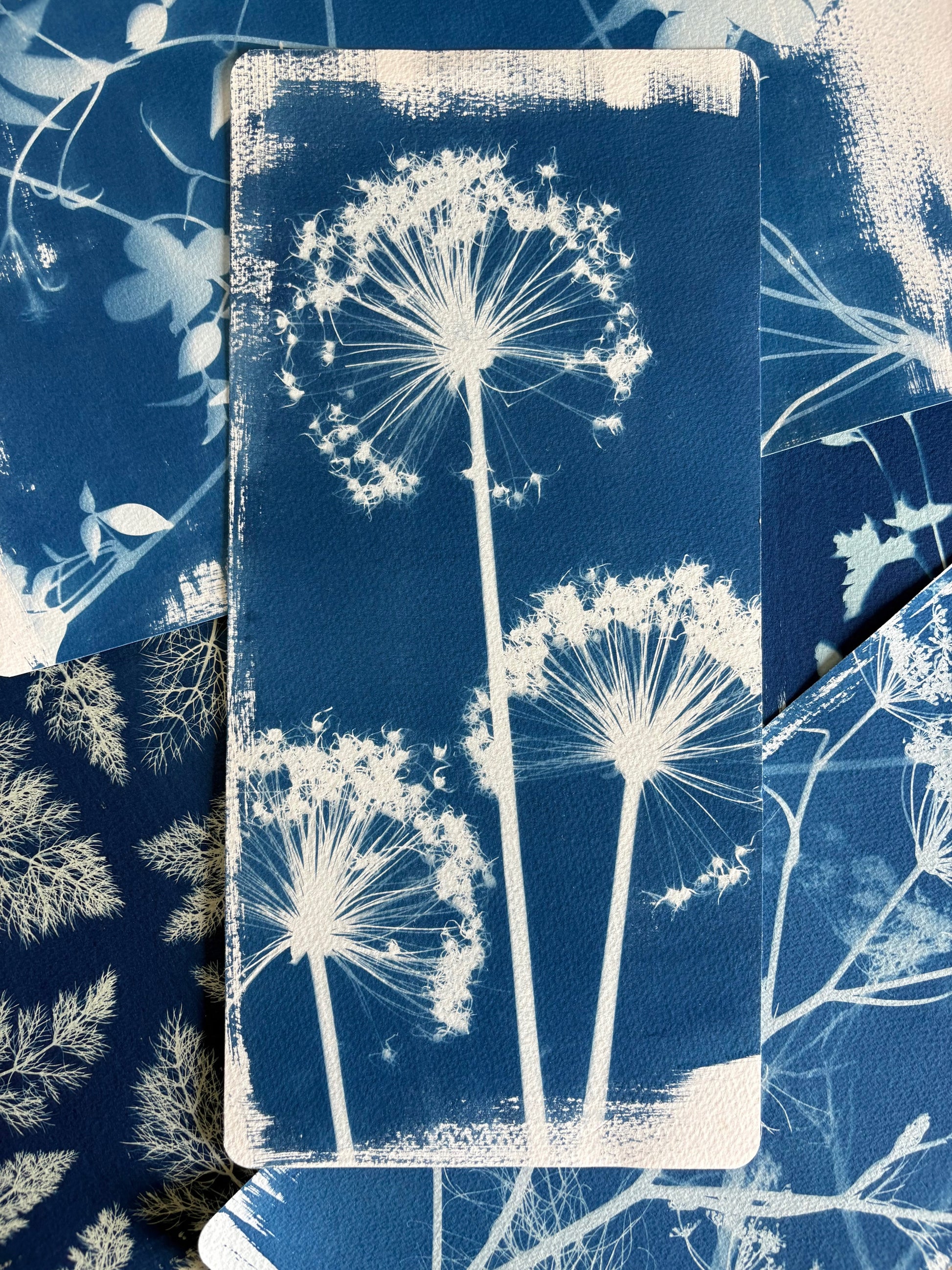 Cyanotype is one of the simplest forms of Photography where chemically treated paper becomes light sensitive, turning a deep Cyan Blue colour when exposed. Danielle has been creating Cyanotypes for last couple of years experimenting with the process, composition, and also the brush marks and shapes that are created when coating the paper that's going to be exposed.