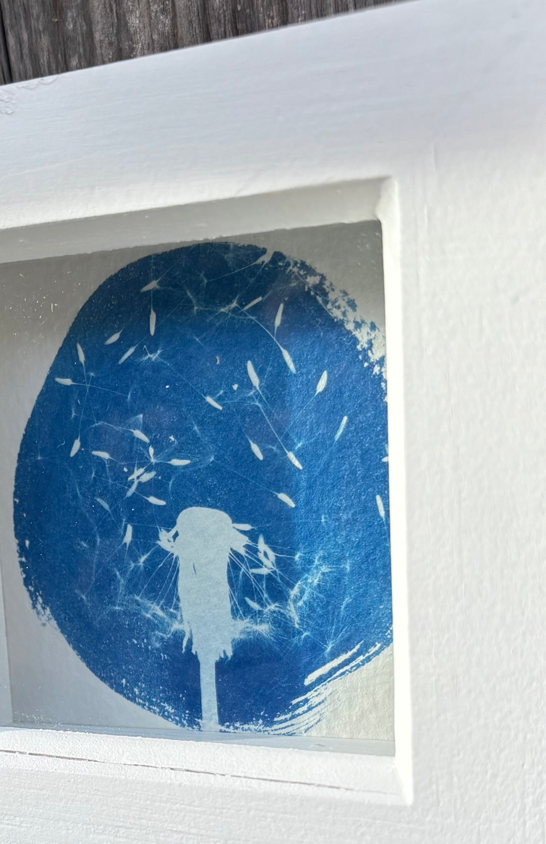 An Original Cyanotype of a Dandelion Clock in a white square glass box frame