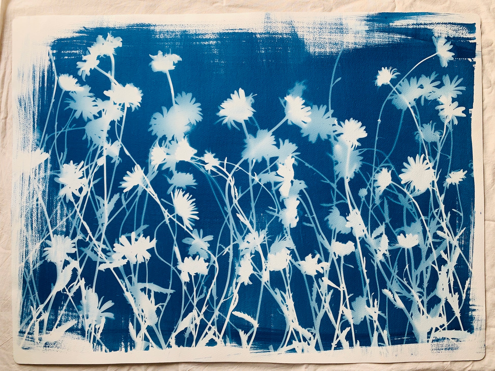 Cyanotype is one of the simplest forms of Photography where chemically treated paper becomes light sensitive, turning a deep Cyan Blue colour when exposed. Danielle has been creating Cyanotypes for last couple of years experimenting with the process, composition, and also the brush marks and shapes that are created when coating the paper that's going to be exposed.